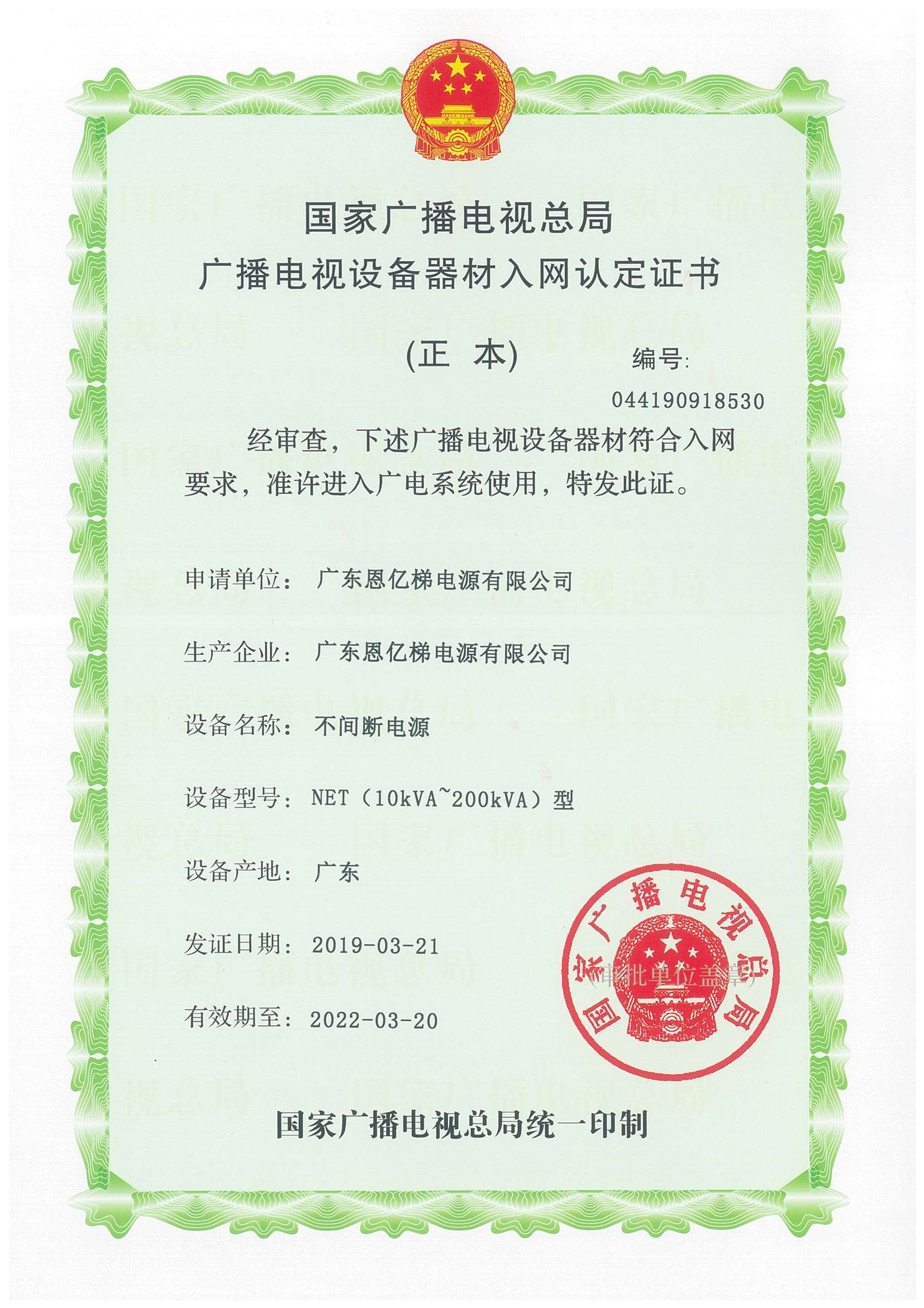 國(guó)家廣播電影電視總局入網(wǎng)認(rèn)定證書(不間斷電源)
